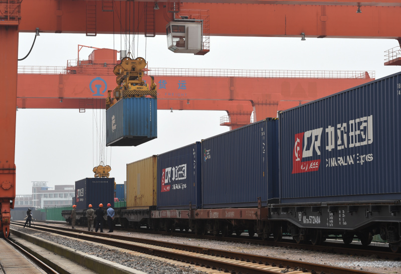 5月13日,工作人员为2017年第1000列中欧班列装载集装箱。