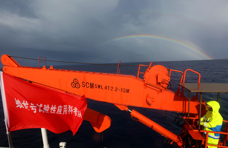 6月5日,工作人员布放水声吊阵设备,以保持潜水器与水面的通话和联系,彩虹出现在南方的天空中。