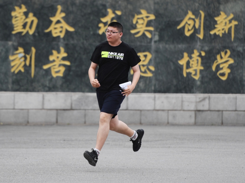 6月6日,在吉林长春第二实验中学考点,一位前来查看考场的考生跑向考场。