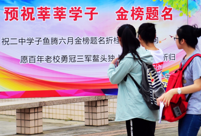 6月6日,福建莆田第二中学的高考考生在阅读学校送出的高考祝愿。