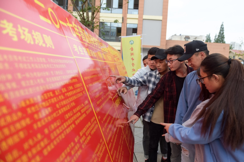 6月6日,来自安徽省合肥市第三十五中学西藏班的考生在金湖中学考点查看考场分布示意图。