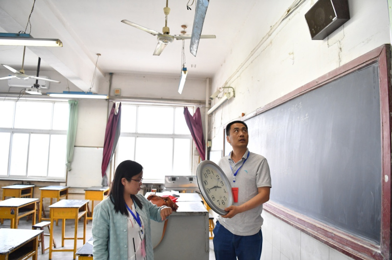 6月6日,在河北枣强中学考点,监考老师在考场内根据统一的语音播报调整时间。