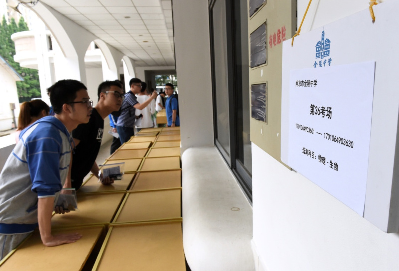 6月6日,考生在江苏南京金陵中学考点查看考场。